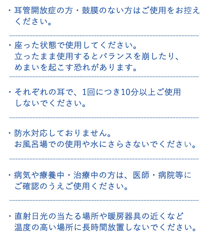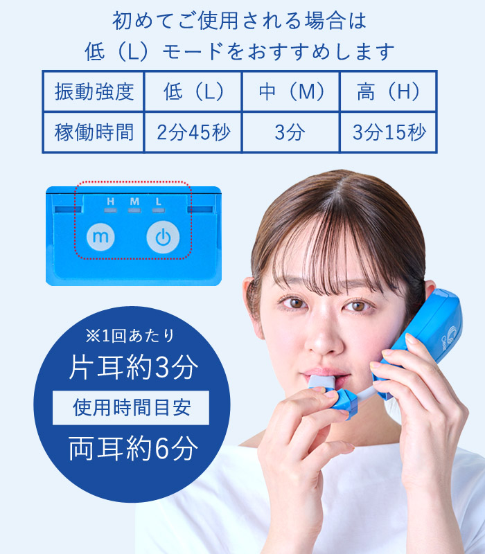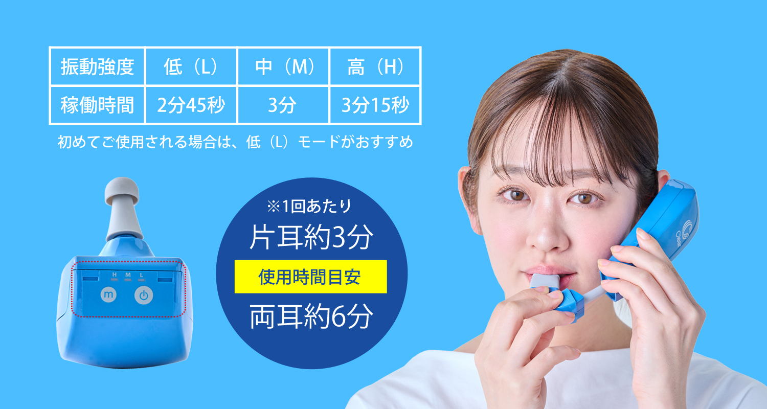 A 1回のご使用時、片耳 約3分(両耳約6分)を目安にご使用ください。また片耳10分以上のご使用はお控えください。