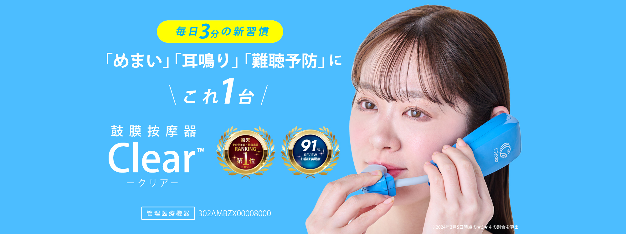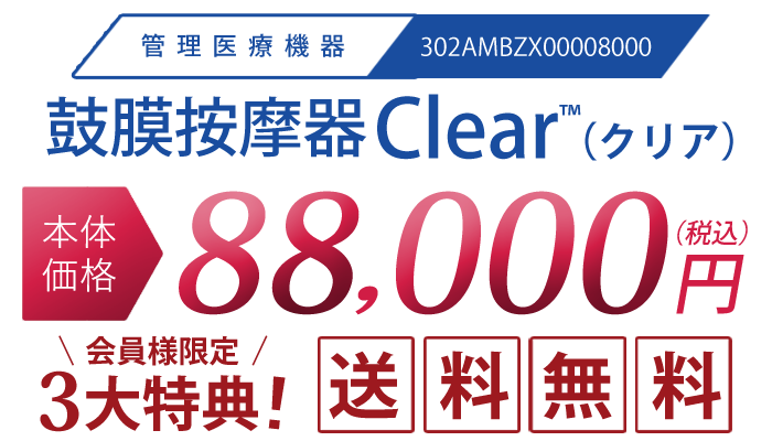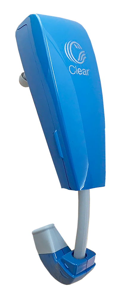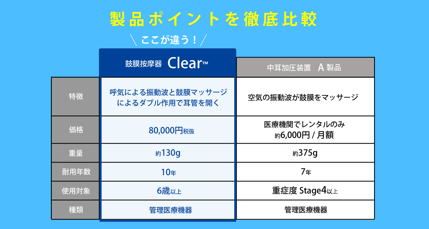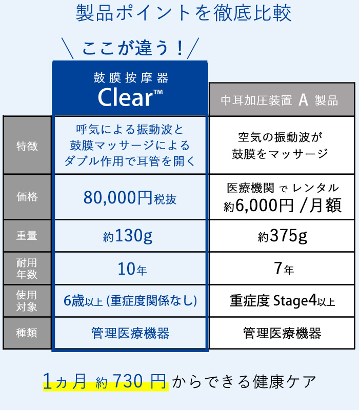 A 病院でレンタルなどされている中耳加圧装置は、空気の振動波で鼓膜をマッサージするのに対し、「Clear」は呼気による空気の振動波と、バイブレーション機能の振動周波数が組み合わさることで、鼓膜マッサージだけでなく耳管を開くことができる唯一の治療器です。
