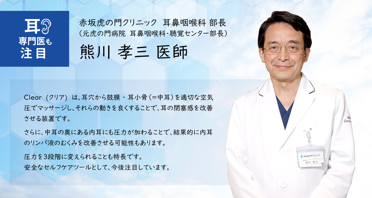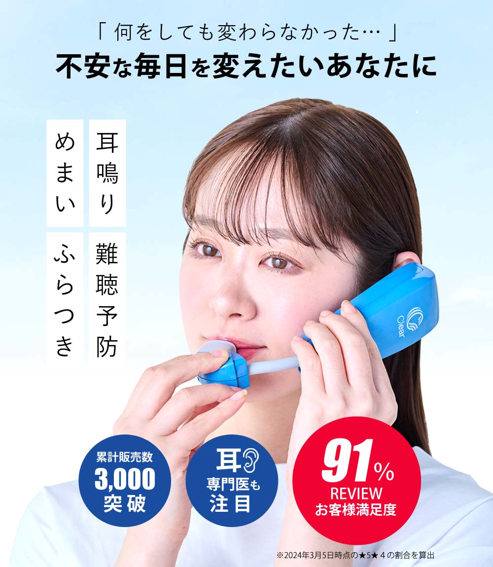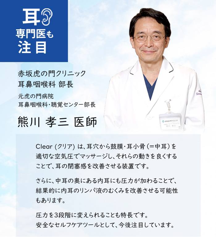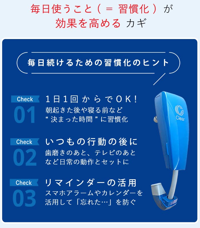A 病院でレンタルなどされている中耳加圧装置は、空気の振動波で鼓膜をマッサージするのに対し、「Clear」は呼気による空気の振動波と、バイブレーション機能の振動周波数が組み合わさることで、鼓膜マッサージだけでなく耳管を開くことができる唯一の治療器です。