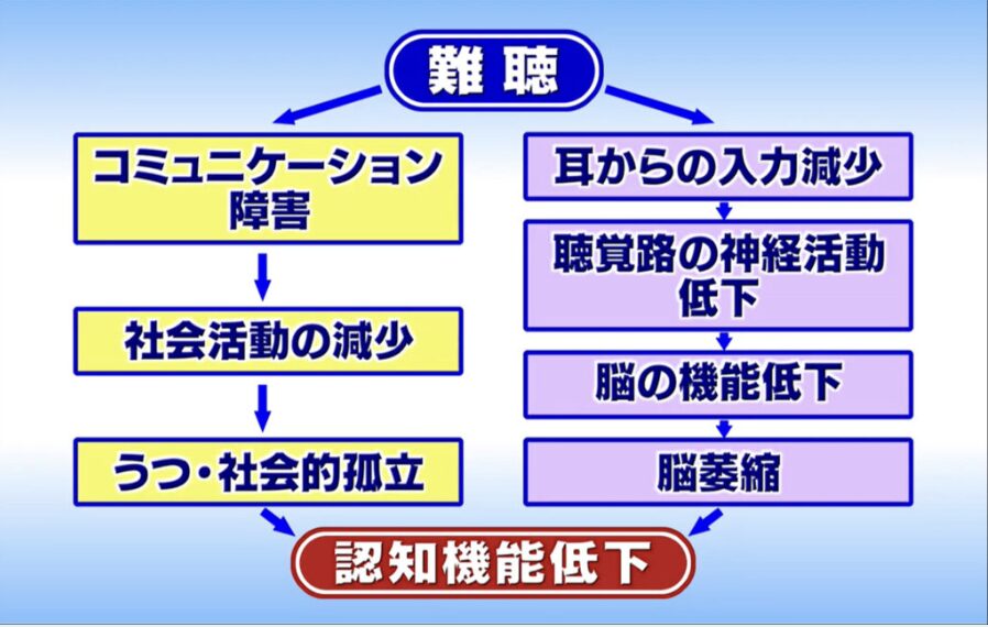 耳から脳への情報は約90%と言われ、難聴により脳への刺激が減少し、脳の機能低下が進み、コミュニケーション障害により「うつ」や「社会的孤立」が引き起こされ、認知症のリスクが高まると考えられます。