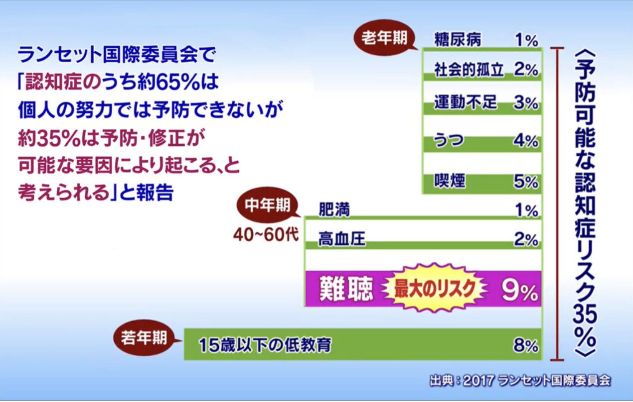 耳から脳への情報は約90%と言われ、難聴により脳への刺激が減少し、脳の機能低下が進み、コミュニケーション障害により「うつ」や「社会的孤立」が引き起こされ、認知症のリスクが高まると考えられます。